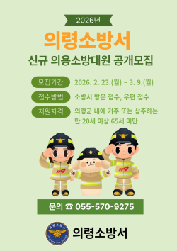 [진주뉴스 홍영우 기자] 경남 의령소방서가 지역사회 안전과 봉사에 뜻이 있는 의령군민을 대상으로 신규 의용소방대원을 모집한다.