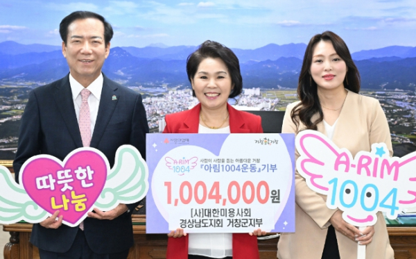 [진주뉴스 이성호 기자] 거창군은 지난 24일 (사)대한미용사회 경상남도지회 거창군지부(지부장 구희자)가 지역내어려운 이웃을 돕기 위한 성금 100만 4천 원을 아림1004운동에 기부했다고 밝혔다.