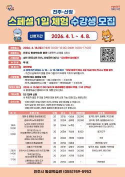 [진주뉴스 홍진숙 기자] 진주시 평생학습관이 4월 1일부터 8일까지 '진주-산청 스페셜 1일 체험' 프로그램 참가자를 모집한다.